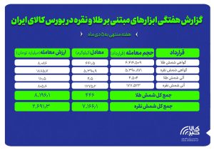 بررسی عملکرد ابزارهای مبتنی بر طلا و نقره در بورس کالای ایران نشان میدهد که در هفته گذشته نزدیک به ۹ تن شمش نقره و ۷۳۶ کیلوگرم شمش طلا در بازار گواهی سپرده و آتی معامله شد.